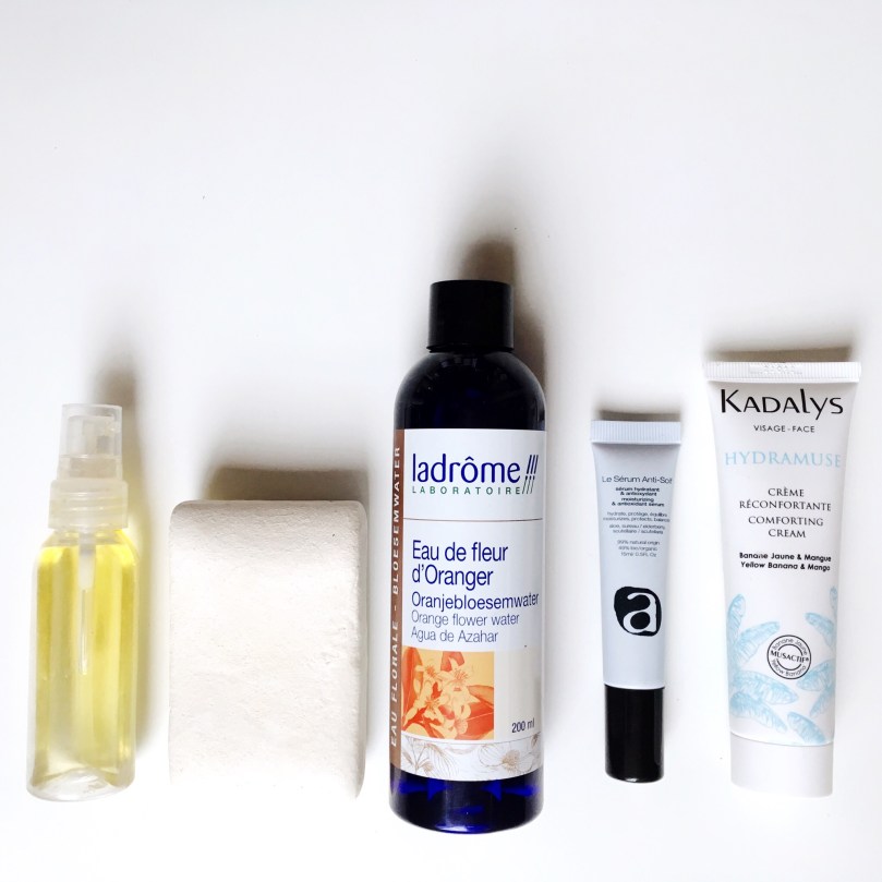 TONIQUE : Hydrolat au choix selon les besoins, mon humeur, mes envies que j’applique avec un coton bio réutilisable.